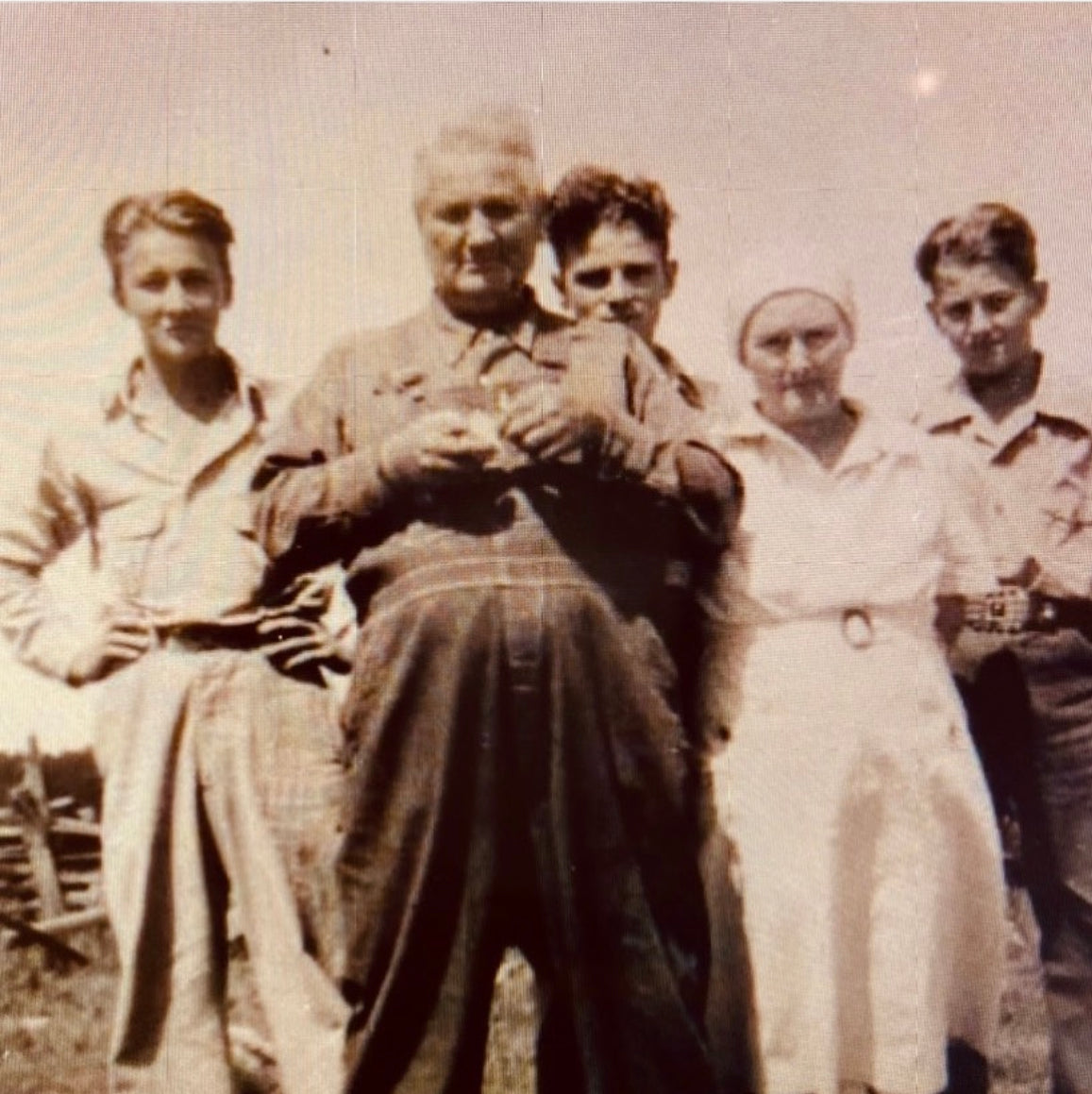 Here stands Grandpa George & Grandma Rebecca with 3 of thier 12 Children! Our father, the boy to the left, took over the farm and expanded it to 180 Acres!